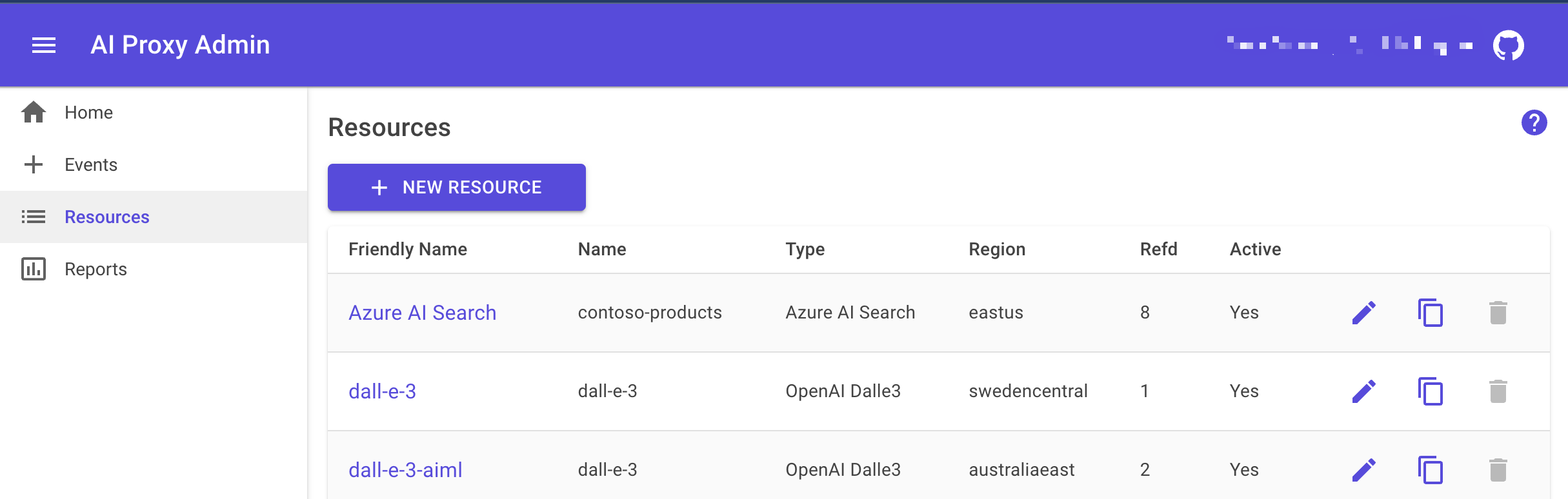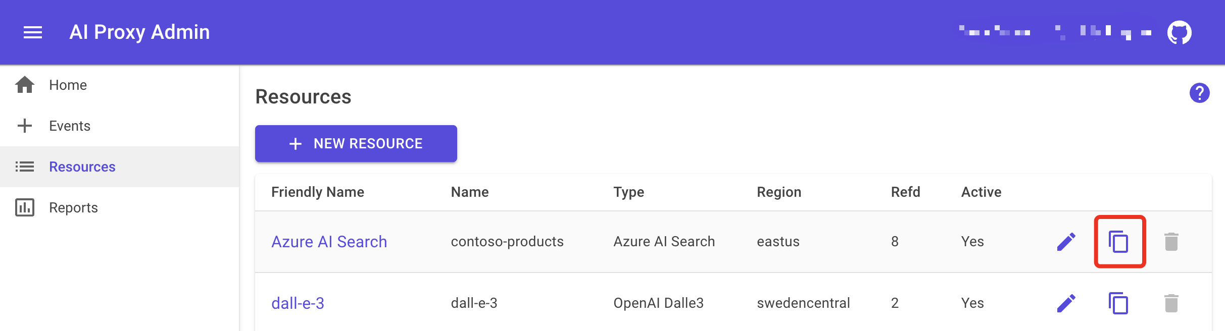 To duplicate a resource, click on the Duplicate icon next to the resource you want to duplicate.